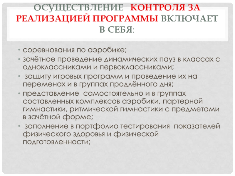 Слайд 9Осуществление контроля за реализацией программы включает в себя: