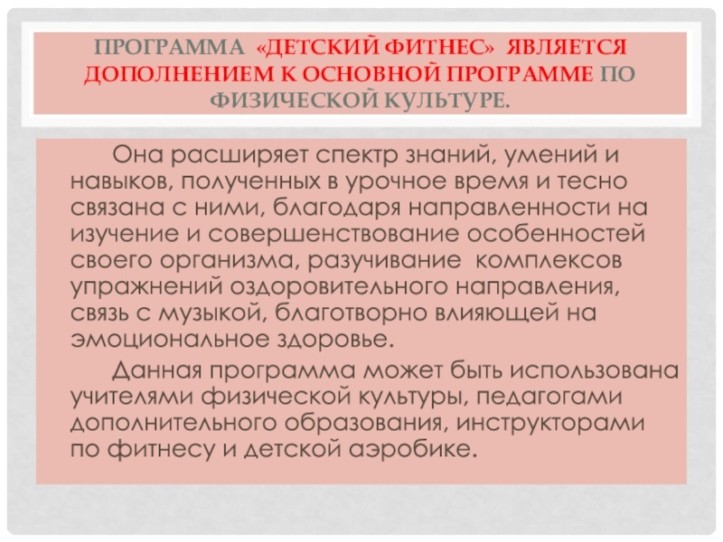 Слайд 11Программа «Детский фитнес» является дополнением к основной программе по физической культуре.