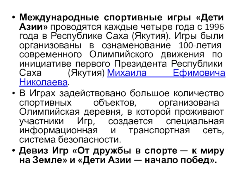 Слайд 8Международные спортивные игры «Дети Азии» проводятся каждые четыре года с 1996 года