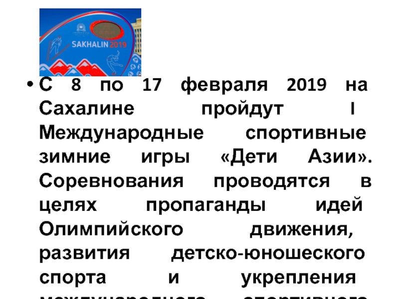 С 8 по 17 февраля 2019 на Сахалине пройдут I Международные спортивные зимние игры «Дети Азии». Соревнования проводятся в целях пропаганды идей Олимпийского движения, развития детско-юношеского спорта и укрепления международного спортивного сотрудничества.