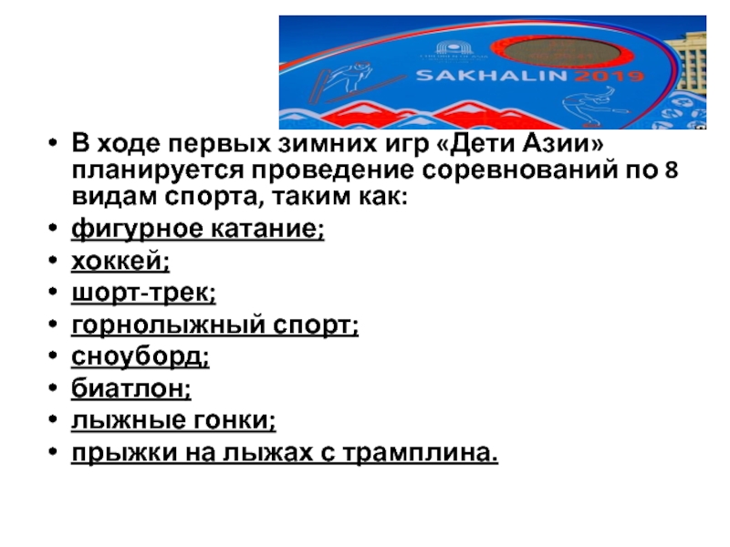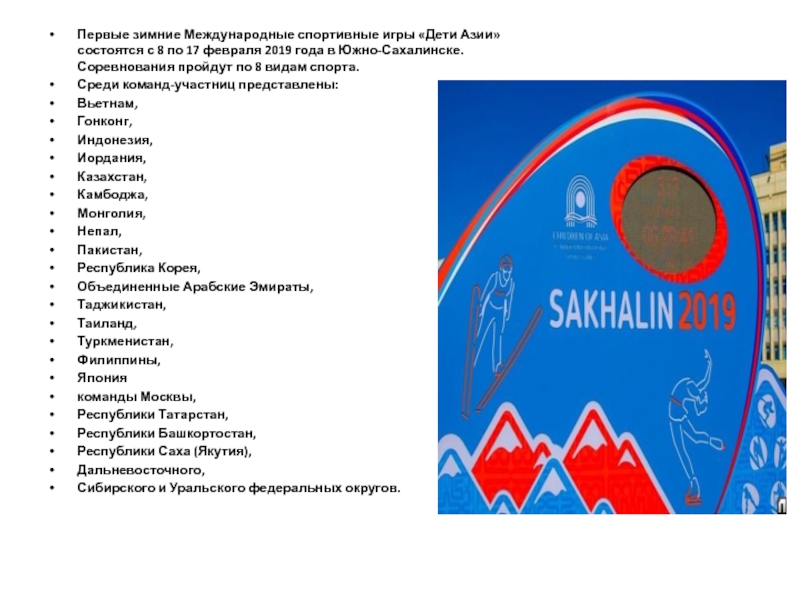 С 8 по 17 февраля 2019 на Сахалине пройдут I Международные спортивные зимние игры «Дети Азии». Соревнования