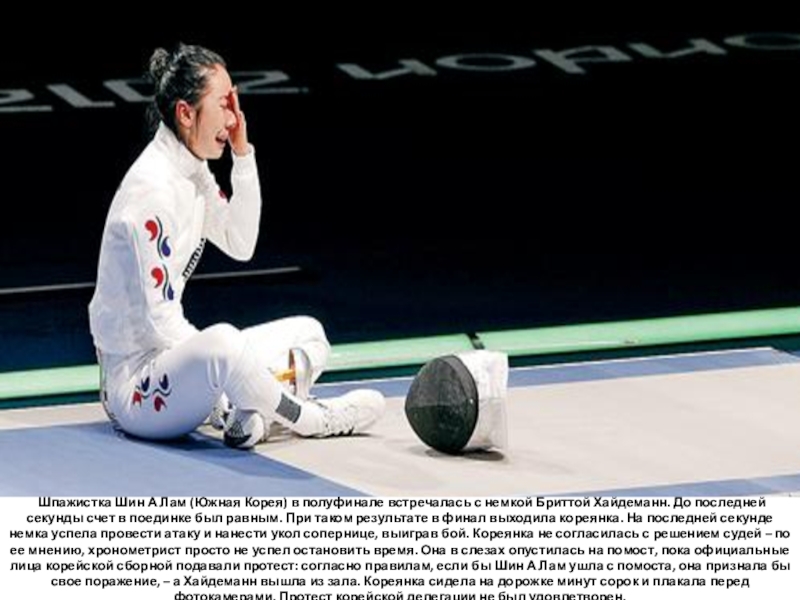немкой Бриттой Хайдеманн. До последней секунды счет в поединке был равным. При таком результате в финал выходила кореянка. На последней секунде немка успела провести атаку и нанести укол сопернице, выиграв бой. Кореянка не согласилась с решением судей – по ее мнению, хронометрист просто не успел остановить время. Она в слезах опустилась на помост, пока официальные лица корейской сборной подавали протест: согласно правилам, если бы Шин А Лам ушла с помоста, она признала бы свое поражение, – а Хайдеманн вышла из зала. Кореянка сидела на дорожке минут сорок и плакала перед фотокамерами. Протест корейской делегации не был удовлетворен.
