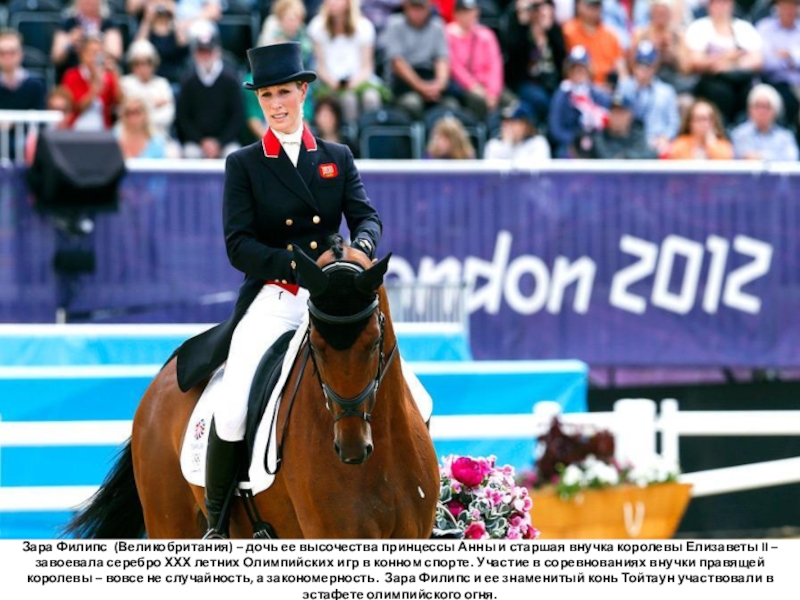 внучка королевы Елизаветы II – завоевала серебро ХХХ летних Олимпийских игр в конном спорте. Участие в соревнованиях внучки правящей королевы – вовсе не случайность, а закономерность. Зара Филипс и ее знаменитый конь Тойтаун участвовали в эстафете олимпийского огня.