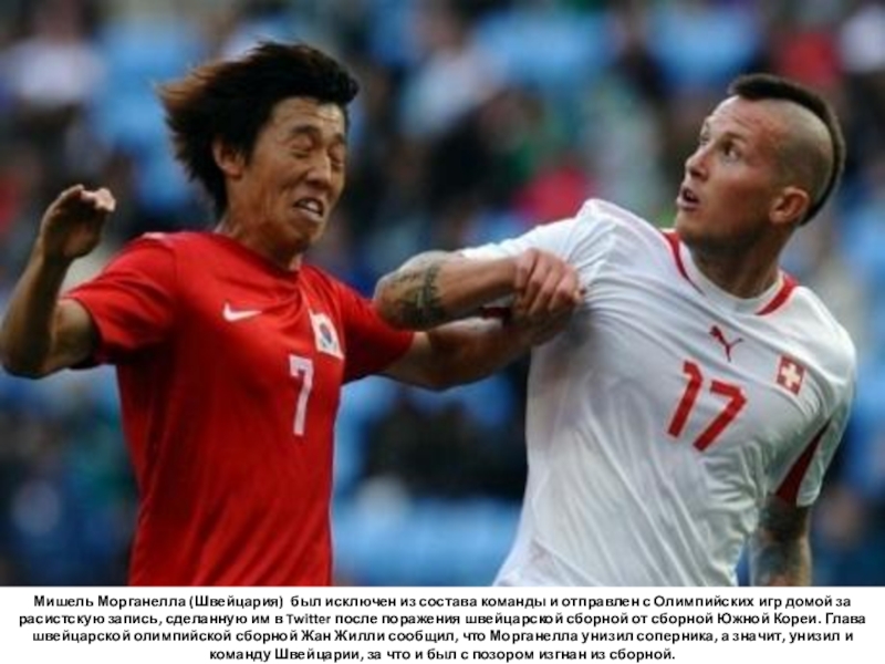 Олимпийских игр домой за расистскую запись, сделанную им в Twitter после поражения швейцарской сборной от сборной Южной Кореи. Глава швейцарской олимпийской сборной Жан Жилли сообщил, что Морганелла унизил соперника, а значит, унизил и команду Швейцарии, за что и был с позором изгнан из сборной.