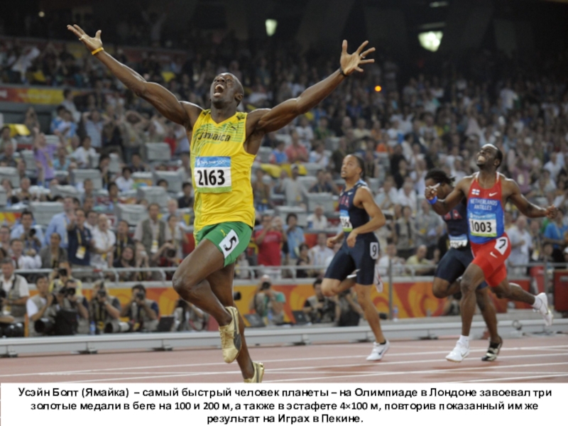 Слайд 3Усэйн Болт (Ямайка) – самый быстрый человек планеты – на Олимпиаде