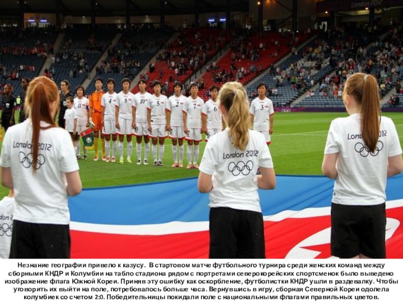 женских команд между сборными КНДР и Колумбии на табло стадиона рядом с портретами северокорейских спортсменок было выведено изображение флага Южной Кореи. Приняв эту ошибку как оскорбление, футболистки КНДР ушли в раздевалку. Чтобы уговорить их выйти на поле, потребовалось больше часа. Вернувшись в игру, сборная Северной Кореи одолела колумбиек со счетом 2:0. Победительницы покидали поле с национальными флагами правильных цветов.
