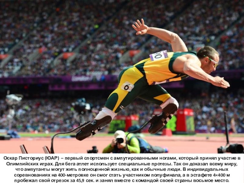 Слайд 4Оскар Писториус (ЮАР) – первый спортсмен с ампутированными ногами, который принял