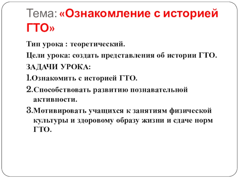 Слайд 3Тема: «Ознакомление с историей ГТО»