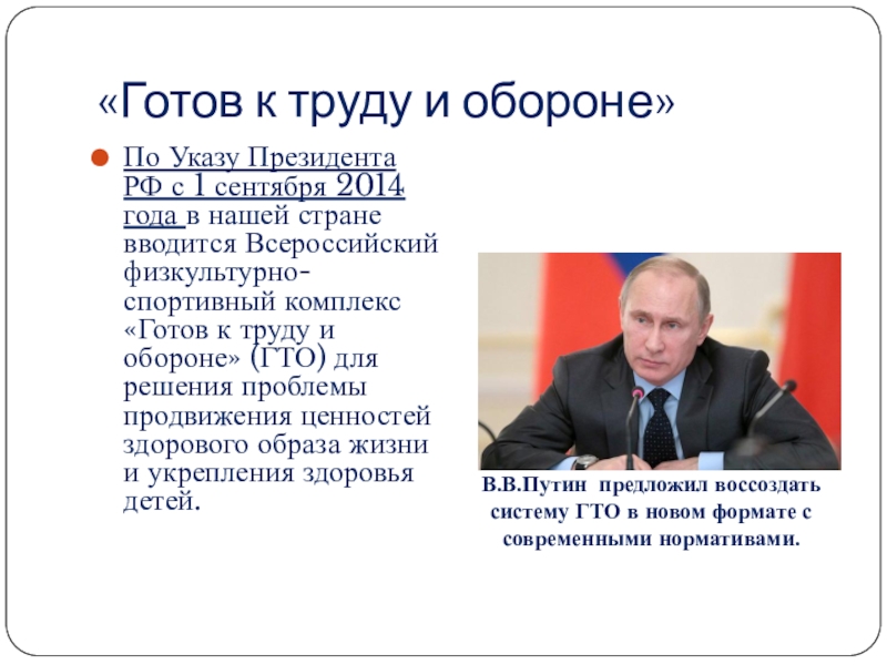 В.В.Путин предложил воссоздать систему ГТО в новом формате с современными нормативами.