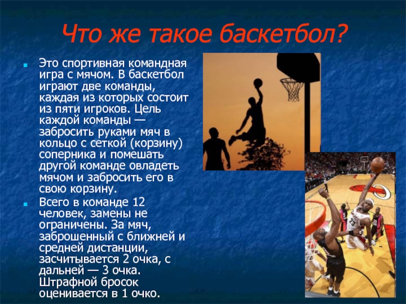 Что же такое баскетбол?Это спортивная командная игра с мячом. В баскетбол играют две команды, каждая из которых