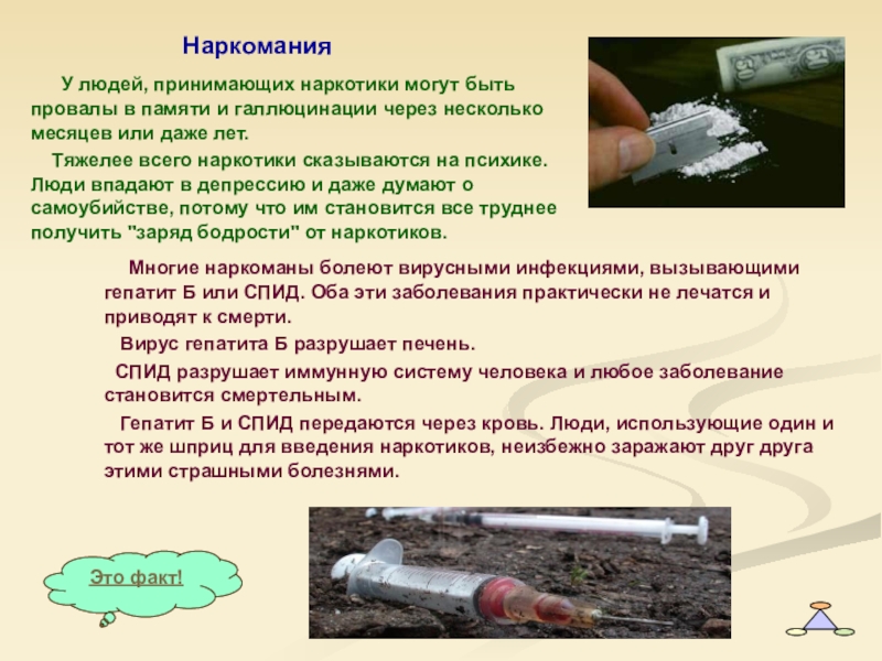 Гепатит Б и СПИД передаются через кровь. Люди, использующие один и тот же шприц для введения наркотиков, неизбежно заражают друг друга этими страшными болезнями.