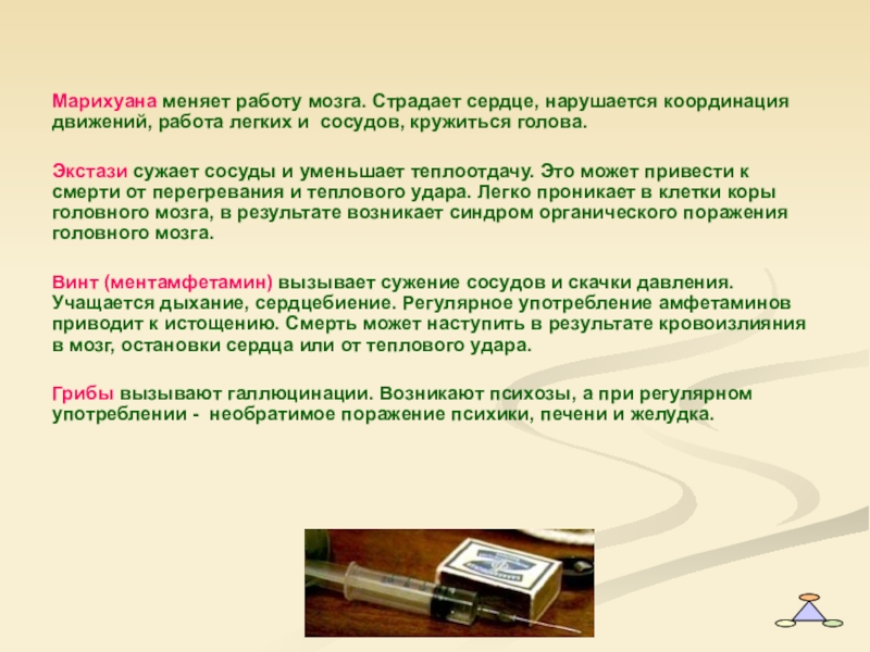 Слайд 19Марихуана меняет работу мозга. Страдает сердце, нарушается координация движений, работа легких