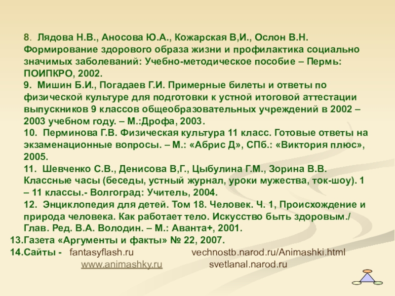 10. Перминова Г.В. Физическая культура 11 класс. Готовые ответы на экзаменационные вопросы. – М.: «Абрис Д», СПб.: «Виктория плюс», 2005.