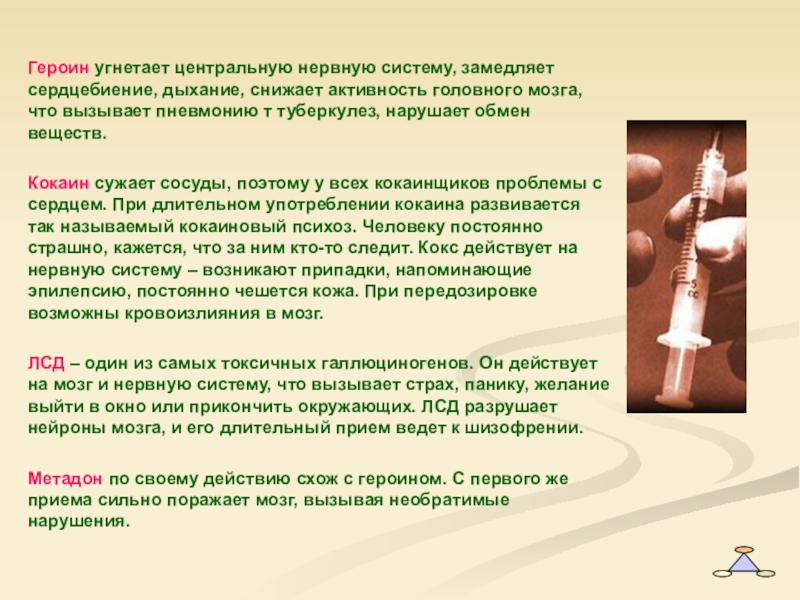 Слайд 20Героин угнетает центральную нервную систему, замедляет сердцебиение, дыхание, снижает активность головного