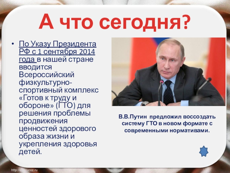А что сегодня?По Указу Президента РФ с 1 сентября 2014 года в нашей стране вводится Всероссийский физкультурно-спортивный