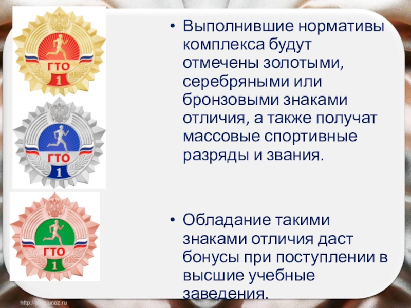 Слайд 11Выполнившие нормативы комплекса будут отмечены золотыми, серебряными или бронзовыми знаками отличия,