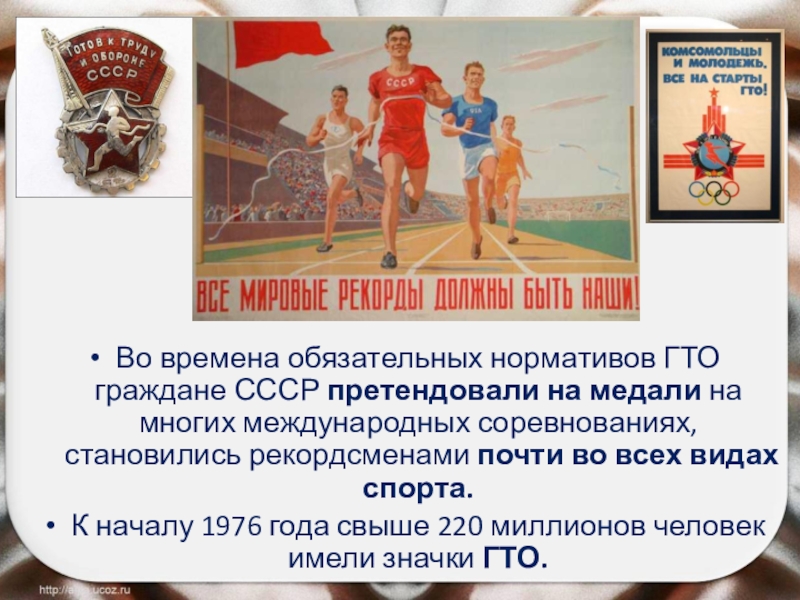 Слайд 7Во времена обязательных нормативов ГТО граждане СССР претендовали на медали на