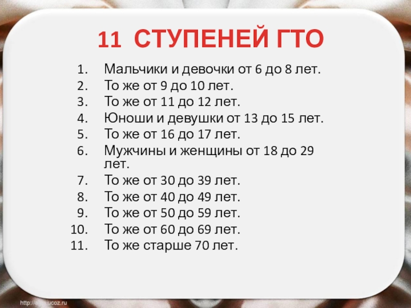 11 СТУПЕНЕЙ ГТОМальчики и девочки от 6 до 8 лет.То же от 9 до 10 лет.То же