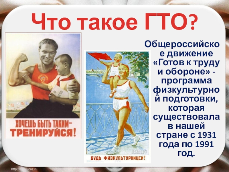 Что такое ГТО?Общероссийское движение «Готов к труду и обороне» - программа физкультурной подготовки, которая существовала в нашей