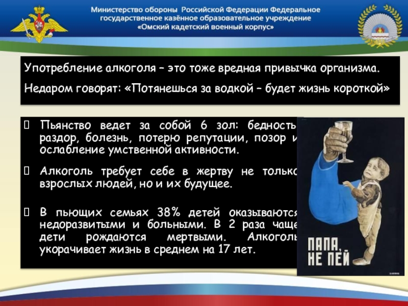 В пьющих семьях 38% детей оказываются недоразвитыми и больными. В 2 раза чаще дети рождаются мертвыми. Алкоголь укорачивает жизнь в среднем на 17 лет.