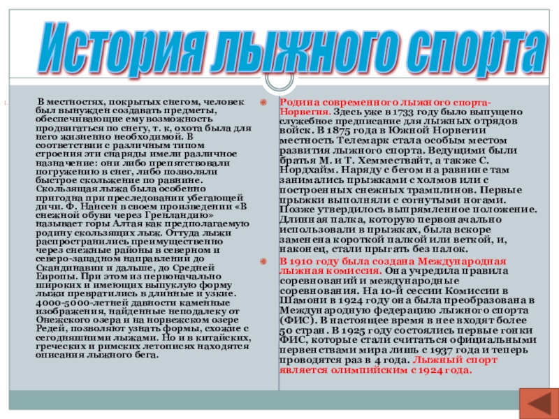 Родина современного лыжного спорта-Норвегия. Здесь уже в 1733 году было выпущено служебное предписание для лыжных отрядов войск. В 1875 года в Южной Норвегии местность Телемарк стала особым местом развития лыжного спорта. Ведущими были братья М. и Т. Хеммествайт, а также С. Нордхайм. Наряду с бегом на равнине там занимались прыжками с холмов или с построенных снежных трамплинов. Первые прыжки выполняли с согнутыми ногами. Позже утвердилось выпрямленное положение. Длинная палка, которую первоначально использовали в прыжках, была вскоре заменена короткой палкой или веткой, и, наконец, стали прыгать без палок.