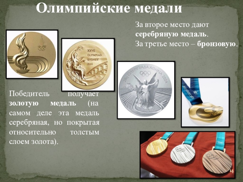 Победитель получает золотую медаль (на самом деле эта медаль серебряная, но покрытая относительно толстым слоем золота).