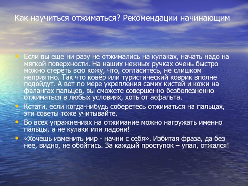 Как научиться отжиматься? Рекомендации начинающим Если вы еще ни разу не отжимались на кулаках, начать надо на