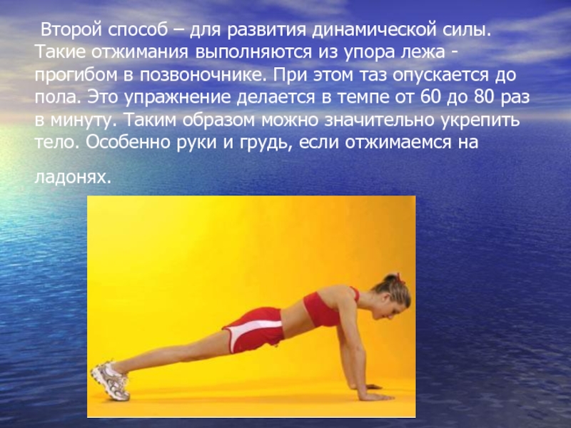 Второй способ – для развития динамической силы. Такие отжимания выполняются из упора лежа - прогибом в