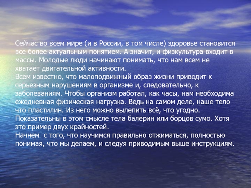 становится все более актуальным понятием. А значит, и физкультура входит в массы. Молодые люди начинают понимать, что нам всем не хватает двигательной активности. Всем известно, что малоподвижный образ жизни приводит к серьезным нарушениям в организме и, следовательно, к заболеваниям. Чтобы организм работал, как часы, нам необходима ежедневная физическая нагрузка. Ведь на самом деле, наше тело что пластилин. Из него можно вылепить всё, что угодно. Показательны в этом смысле тела балерин или борцов сумо. Хотя это пример двух крайностей. Начнем с того, что научимся правильно отжиматься, полностью понимая, что мы делаем, и следуя приводимым выше инструкциям.