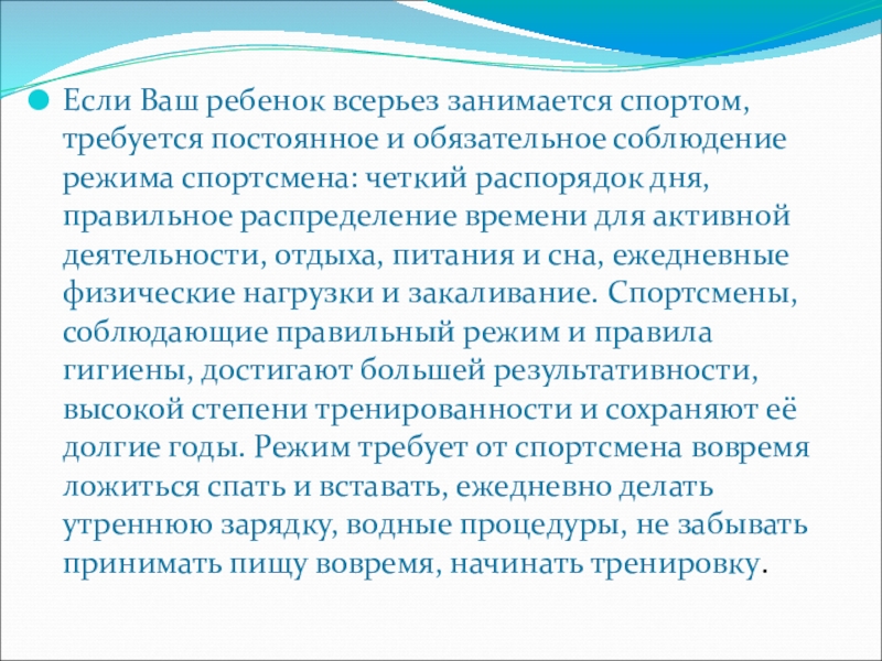 Слайд 29Если Ваш ребенок всерьез занимается спортом, требуется постоянное и обязательное соблюдение