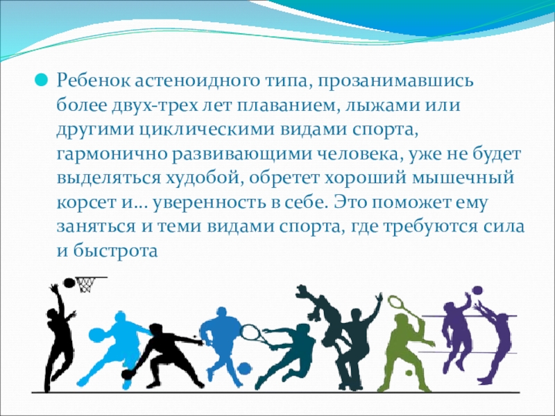 Слайд 7Ребенок астеноидного типа, прозанимавшись более двух-трех лет плаванием, лыжами или другими
