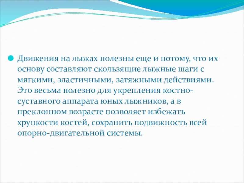 скользящие лыжные шаги с мягкими, эластичными, затяжными действиями. Это весьма полезно для укрепления костно-суставного аппарата юных лыжников, а в преклонном возрасте позволяет избежать хрупкости костей, сохранить подвижность всей опорно-двигательной системы.