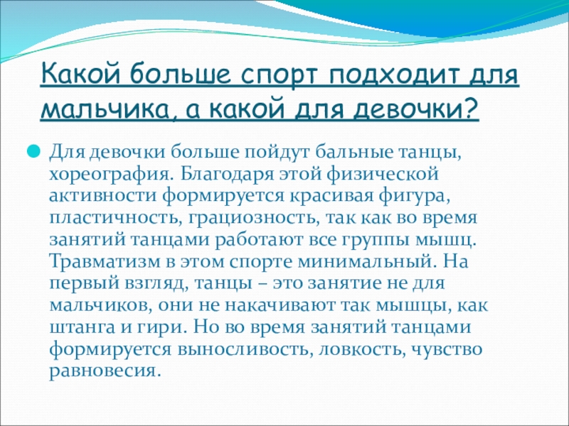 Слайд 9Какой больше спорт подходит для мальчика, а какой для девочки?