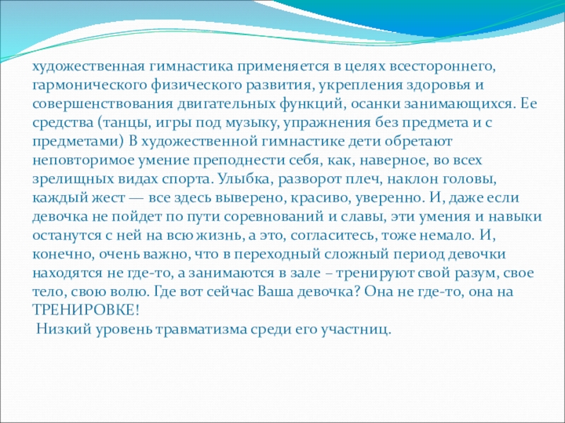 и совершенствования двигательных функций, осанки занимающихся. Ее средства (танцы, игры под музыку, упражнения без предмета и с предметами) В художественной гимнастике дети обретают неповторимое умение преподнести себя, как, наверное, во всех зрелищных видах спорта. Улыбка, разворот плеч, наклон головы, каждый жест — все здесь выверено, красиво, уверенно. И, даже если девочка не пойдет по пути соревнований и славы, эти умения и навыки останутся с ней на всю жизнь, а это, согласитесь, тоже немало. И, конечно, очень важно, что в переходный сложный период девочки находятся не где-то, а занимаются в зале – тренируют свой разум, свое тело, свою волю. Где вот сейчас Ваша девочка? Она не где-то, она на ТРЕНИРОВКЕ!