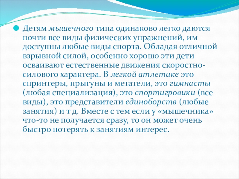 Слайд 6Детям мышечного типа одинаково легко даются почти все виды физических упражнений,