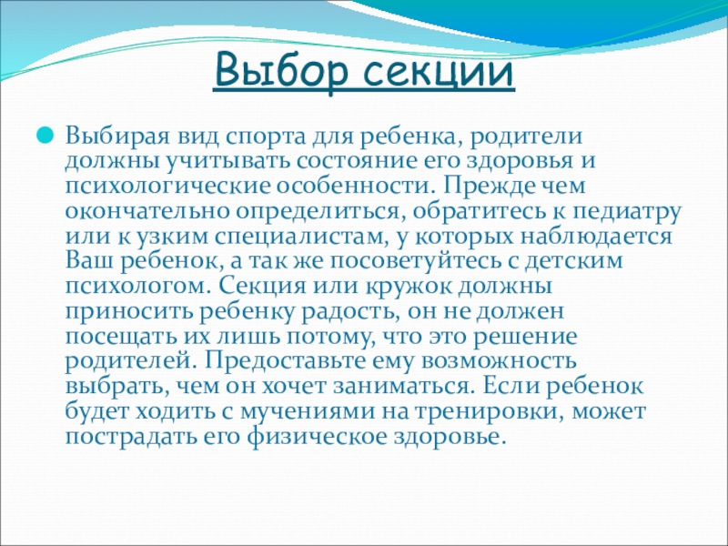 здоровья и психологические особенности. Прежде чем окончательно определиться, обратитесь к педиатру или к узким специалистам, у которых наблюдается Ваш ребенок, а так же посоветуйтесь с детским психологом. Секция или кружок должны приносить ребенку радость, он не должен посещать их лишь потому, что это решение родителей. Предоставьте ему возможность выбрать, чем он хочет заниматься. Если ребенок будет ходить с мучениями на тренировки, может пострадать его физическое здоровье.