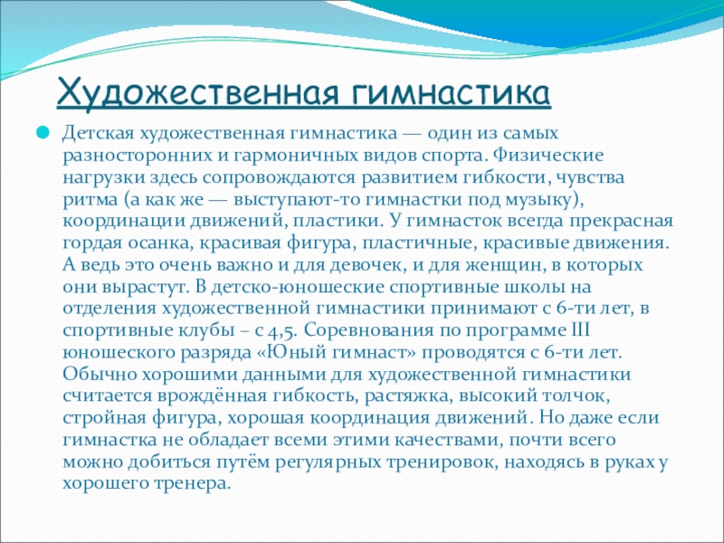видов спорта. Физические нагрузки здесь сопровождаются развитием гибкости, чувства ритма (а как же — выступают-то гимнастки под музыку), координации движений, пластики. У гимнасток всегда прекрасная гордая осанка, красивая фигура, пластичные, красивые движения. А ведь это очень важно и для девочек, и для женщин, в которых они вырастут. В детско-юношеские спортивные школы на отделения художественной гимнастики принимают с 6-ти лет, в спортивные клубы – с 4,5. Соревнования по программе III юношеского разряда «Юный гимнаст» проводятся с 6-ти лет. Обычно хорошими данными для художественной гимнастики считается врождённая гибкость, растяжка, высокий толчок, стройная фигура, хорошая координация движений. Но даже если гимнастка не обладает всеми этими качествами, почти всего можно добиться путём регулярных тренировок, находясь в руках у хорошего тренера.