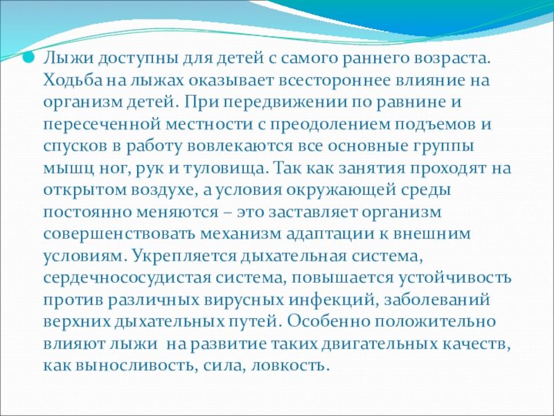 оказывает всестороннее влияние на организм детей. При передвижении по равнине и пересеченной местности с преодолением подъемов и спусков в работу вовлекаются все основные группы мышц ног, рук и туловища. Так как занятия проходят на открытом воздухе, а условия окружающей среды постоянно меняются – это заставляет организм совершенствовать механизм адаптации к внешним условиям. Укрепляется дыхательная система, сердечнососудистая система, повышается устойчивость против различных вирусных инфекций, заболеваний верхних дыхательных путей. Особенно положительно влияют лыжи на развитие таких двигательных качеств, как выносливость, сила, ловкость.