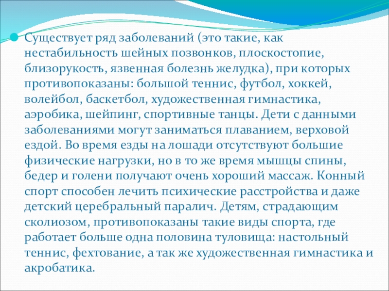 язвенная болезнь желудка), при которых противопоказаны: большой теннис, футбол, хоккей, волейбол, баскетбол, художественная гимнастика, аэробика, шейпинг, спортивные танцы. Дети с данными заболеваниями могут заниматься плаванием, верховой ездой. Во время езды на лошади отсутствуют большие физические нагрузки, но в то же время мышцы спины, бедер и голени получают очень хороший массаж. Конный спорт способен лечить психические расстройства и даже детский церебральный паралич. Детям, страдающим сколиозом, противопоказаны такие виды спорта, где работает больше одна половина туловища: настольный теннис, фехтование, а так же художественная гимнастика и акробатика.