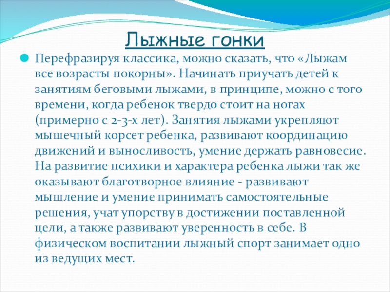 приучать детей к занятиям беговыми лыжами, в принципе, можно с того времени, когда ребенок твердо стоит на ногах (примерно с 2-3-х лет). Занятия лыжами укрепляют мышечный корсет ребенка, развивают координацию движений и выносливость, умение держать равновесие. На развитие психики и характера ребенка лыжи так же оказывают благотворное влияние - развивают мышление и умение принимать самостоятельные решения, учат упорству в достижении поставленной цели, а также развивают уверенность в себе. В физическом воспитании лыжный спорт занимает одно из ведущих мест.