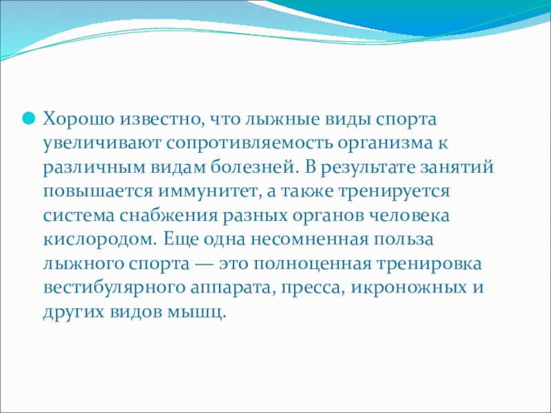 Слайд 27Хорошо известно, что лыжные виды спорта увеличивают сопротивляемость организма к различным