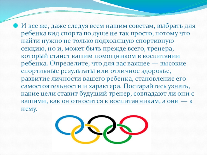 вид спорта по душе не так просто, потому что найти нужно не только подходящую спортивную секцию, но и, может быть прежде всего, тренера, который станет вашим помощником в воспитании ребенка. Определите, что для вас важнее — высокие спортивные результаты или отличное здоровье, развитие личности вашего ребенка, становление его самостоятельности и характера. Постарайтесь узнать, какие цели ставит будущий тренер, совпадают ли они с вашими, как он относится к воспитанникам, а они — к нему.