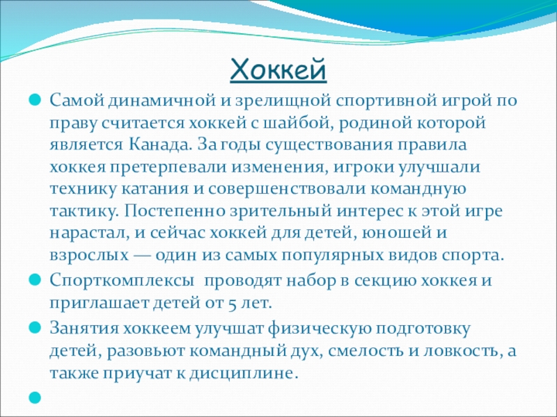 Самой динамичной и зрелищной спортивной игрой по праву считается хоккей с