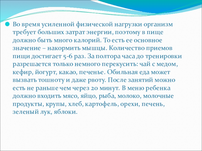 в пище должно быть много калорий. То есть ее основное значение – накормить мышцы. Количество приемов пищи достигает 5-6 раз. За полтора часа до тренировки разрешается только немного перекусить: чай с медом, кефир, йогурт, какао, печенье. Обильная еда может вызвать тошноту и даже рвоту. После занятий можно есть не раньше чем через 20 минут. В меню ребенка должно входить мясо, яйцо, рыба, молоко, молочные продукты, крупы, хлеб, картофель, орехи, печень, зеленый лук, яблоки.