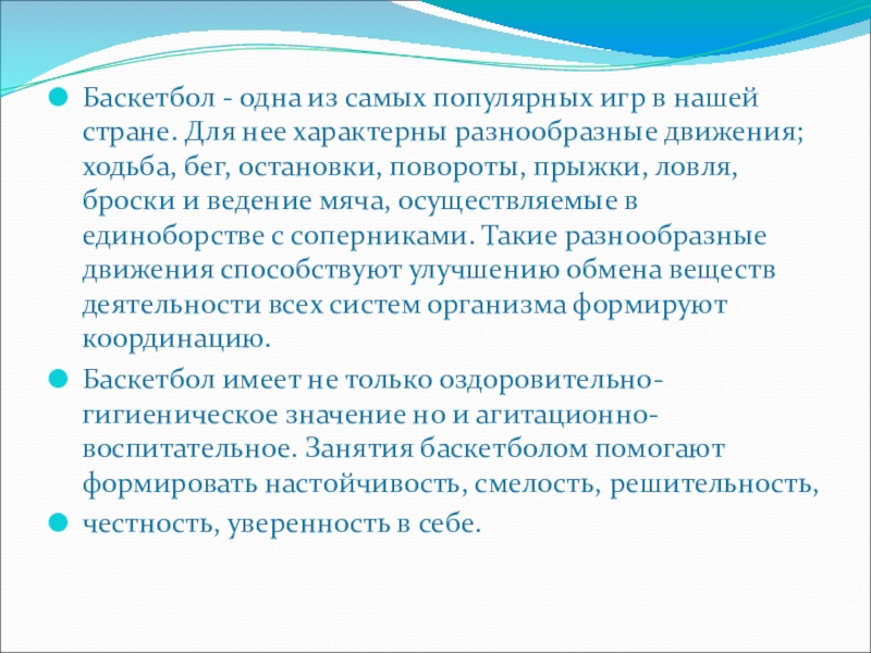 Баскетбол имеет не только оздоровительно-гигиеническое значение но и агитационно-воспитательное. Занятия баскетболом помогают формировать настойчивость, смелость, решительность,