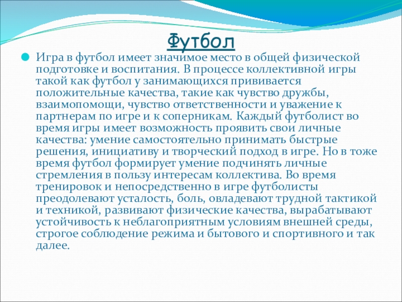 воспитания. В процессе коллективной игры такой как футбол у занимающихся прививается положительные качества, такие как чувство дружбы, взаимопомощи, чувство ответственности и уважение к партнерам по игре и к соперникам. Каждый футболист во время игры имеет возможность проявить свои личные качества: умение самостоятельно принимать быстрые решения, инициативу и творческий подход в игре. Но в тоже время футбол формирует умение подчинять личные стремления в пользу интересам коллектива. Во время тренировок и непосредственно в игре футболисты преодолевают усталость, боль, овладевают трудной тактикой и техникой, развивают физические качества, вырабатывают устойчивость к неблагоприятным условиям внешней среды, строгое соблюдение режима и бытового и спортивного и так далее.