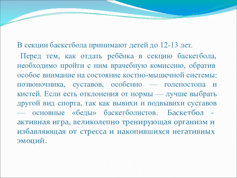 отдать ребёнка в секцию баскетбола, необходимо пройти с ним врачебную комиссию, обратив особое внимание на состояние костно-мышечной системы: позвоночника, суставов, особенно — голеностопа и кистей. Если есть отклонения от нормы — лучше выбрать другой вид спорта, так как вывихи и подвывихи суставов — основные «беды» баскетболистов. Баскетбол - активная игра, великолепно тренирующая организм и избавляющая от стресса и накопившихся негативных эмоций.