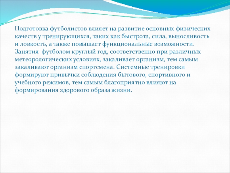 как быстрота, сила, выносливость и ловкость, а также повышает функциональные возможности. Занятия футболом круглый год, соответственно при различных метеорологических условиях, закаливает организм, тем самым закаливают организм спортсмена. Системные тренировки формируют привычки соблюдения бытового, спортивного и учебного режимов, тем самым благоприятно влияют на формирования здорового образа жизни.