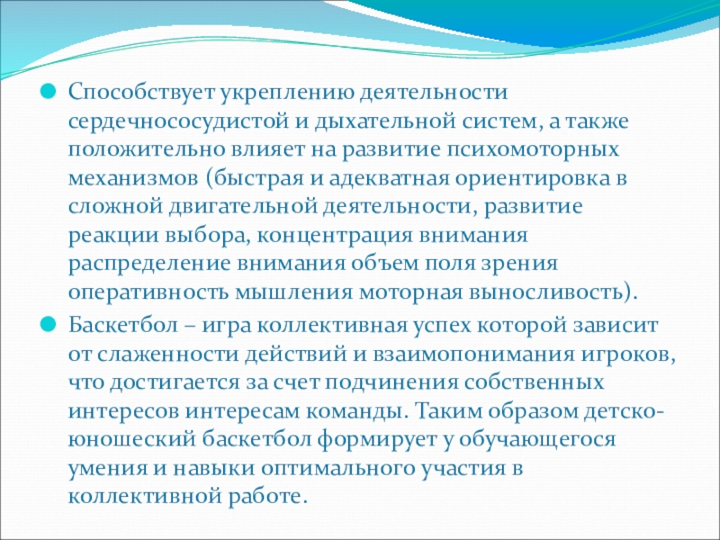 Баскетбол – игра коллективная успех которой зависит от слаженности действий и взаимопонимания игроков, что достигается за счет подчинения собственных интересов интересам команды. Таким образом детско-юношеский баскетбол формирует у обучающегося умения и навыки оптимального участия в коллективной работе.