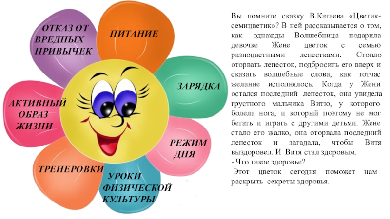 Вы помните сказку В.Катаева «Цветик-семицветик»? В ней рассказывается о том, как однажды Волшебница подарила девочке Жене цветок с семью разноцветными лепестками. Стоило оторвать лепесток, подбросить его вверх и сказать волшебные слова, как тотчас желание исполнялось. Когда у Жени остался последний лепесток, она увидела грустного мальчика Витю, у которого болела нога, и который поэтому не мог бегать и играть с другими детьми. Жене стало его жалко, она оторвала последний лепесток и загадала, чтобы Витя выздоровел. И Витя стал здоровым.